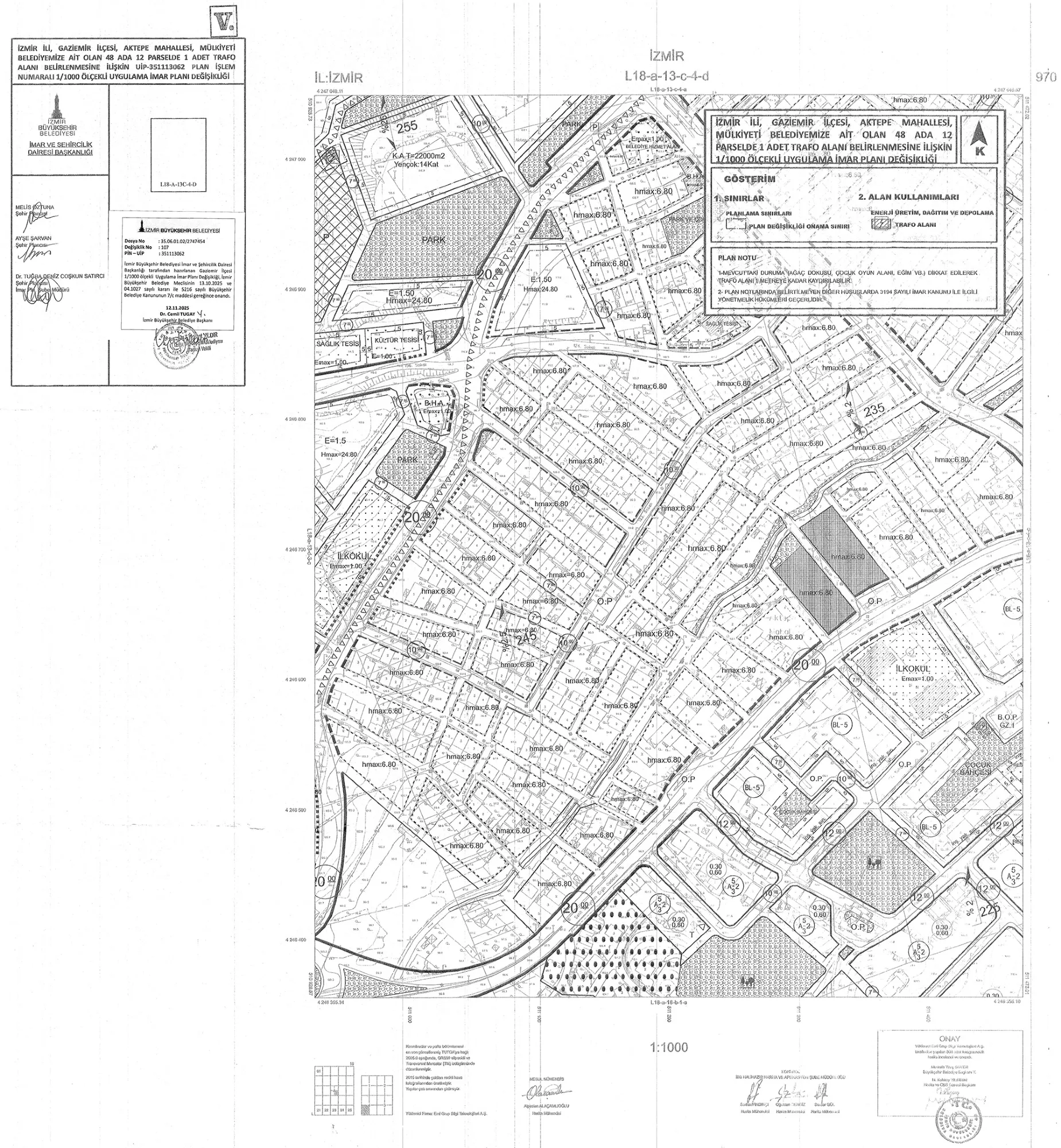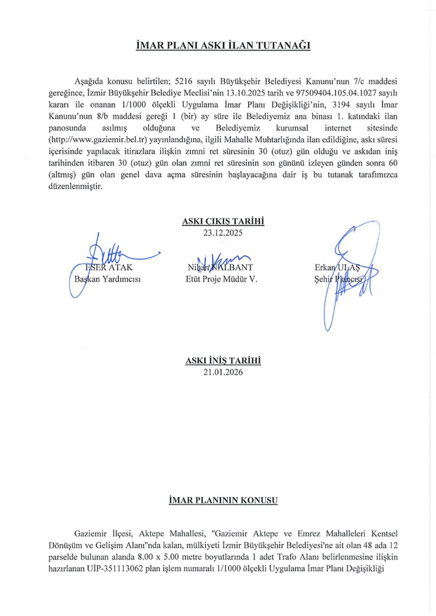 5216 sayılı Büyükşehir Belediyesi Kanunu’nun 7/c maddesi gereğince, İzmir Büyükşehir Belediye Meclisi’nin 13.10.2025 tarih ve 97509404.105.04.1027 sayılı kararı ile onanan 1/1000 ölçekli Uygulama İmar Planı Değişikliği