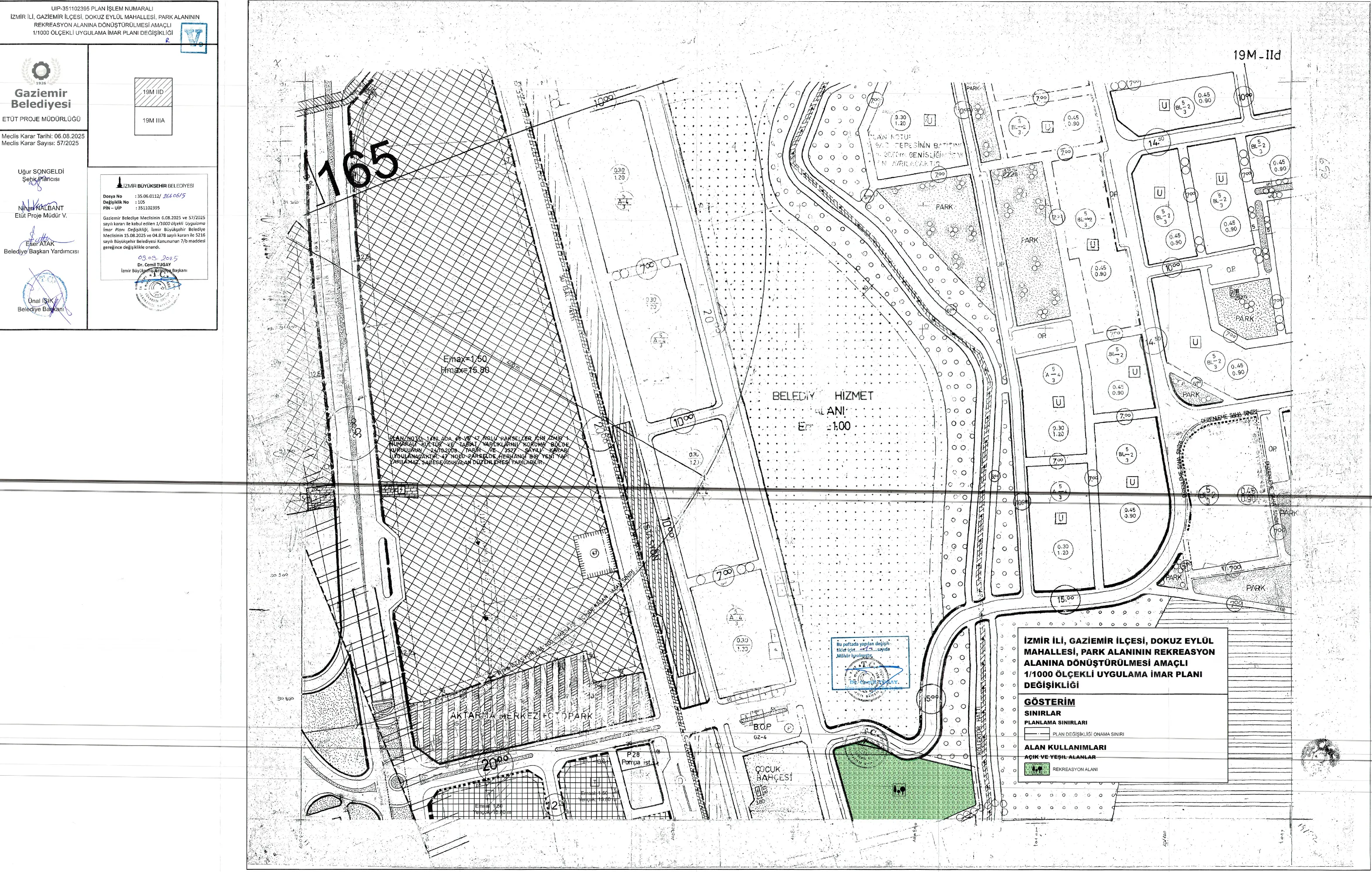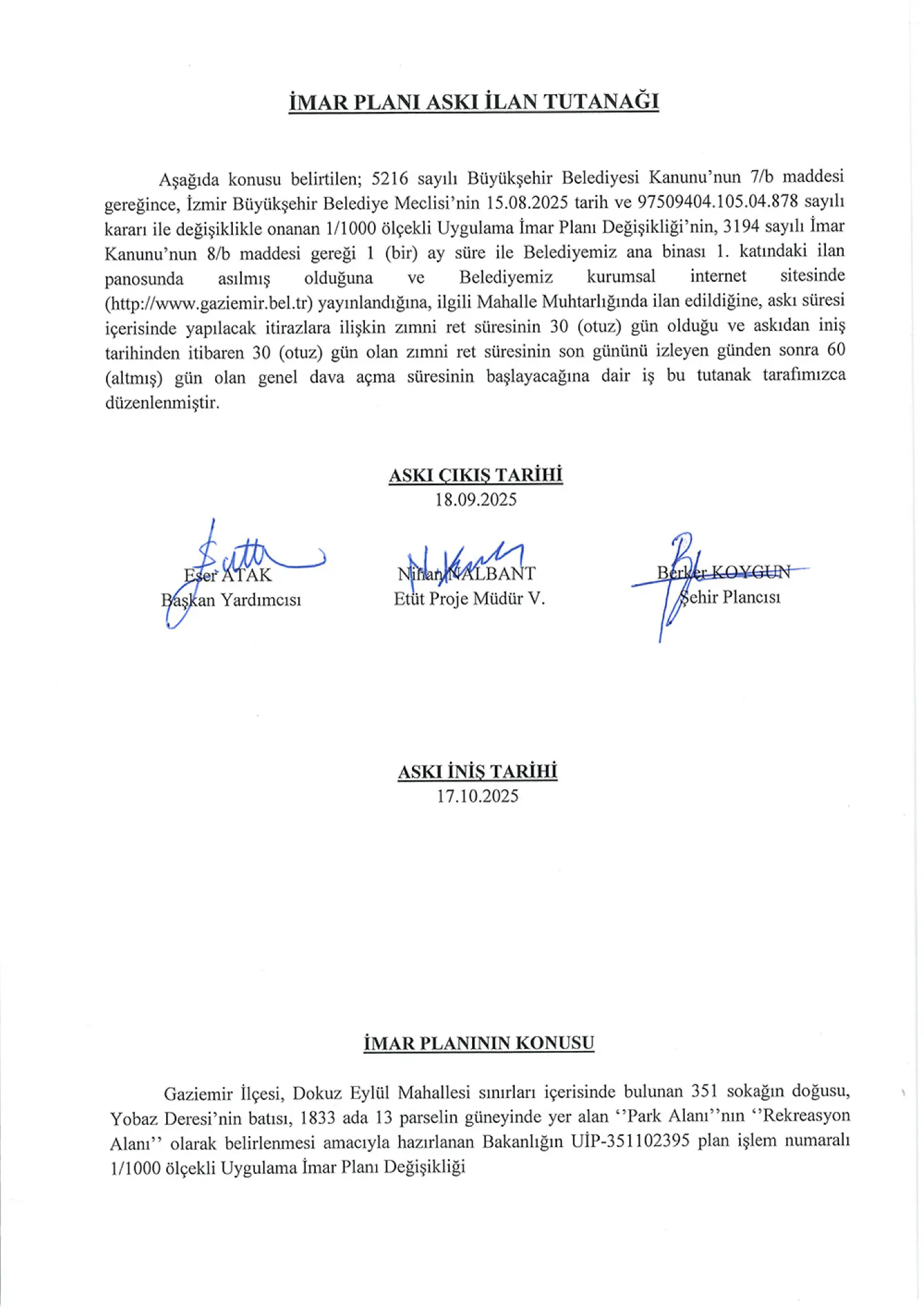 Gaziemir İlçesi, Dokuz Eylül Mahallesi sınırları içerisinde bulunan 351 sokağın doğusu, Yobaz Deresi’nin batısı, 1833 ada 13 parselin güneyinde yer alan ‘’Park Alanı’’nın ‘’Rekreasyon Alanı’’ olarak belirlenmesi amacıyla hazırlanan Bakanlığın UİP-351102395 plan işlem numaralı 1/1000 ölçekli Uygulama İmar Planı Değişikliği