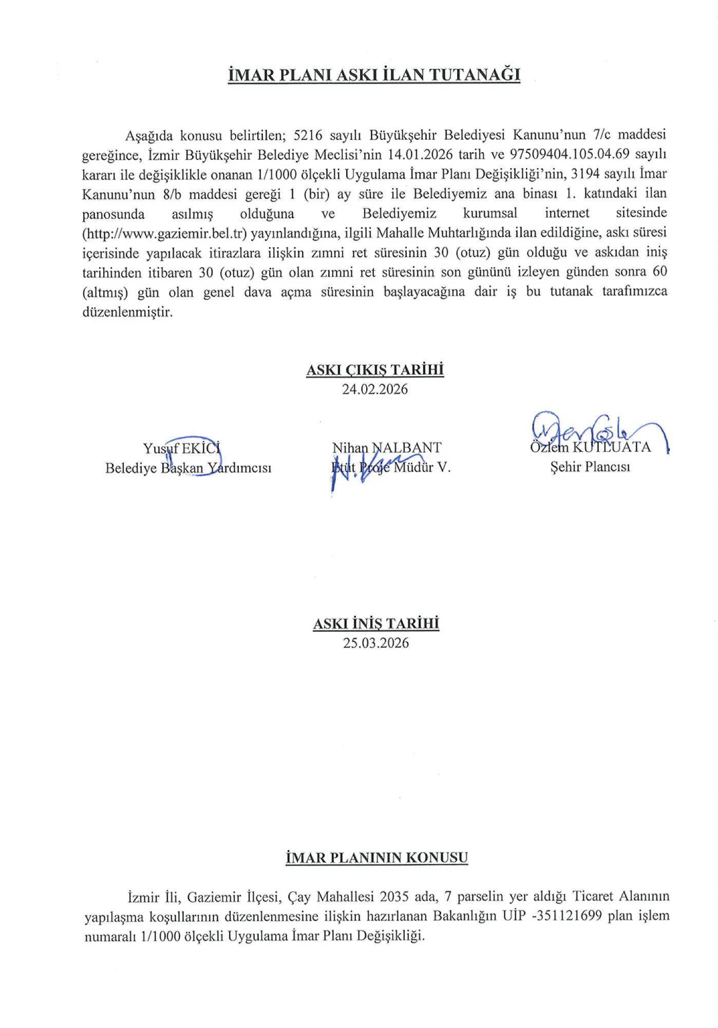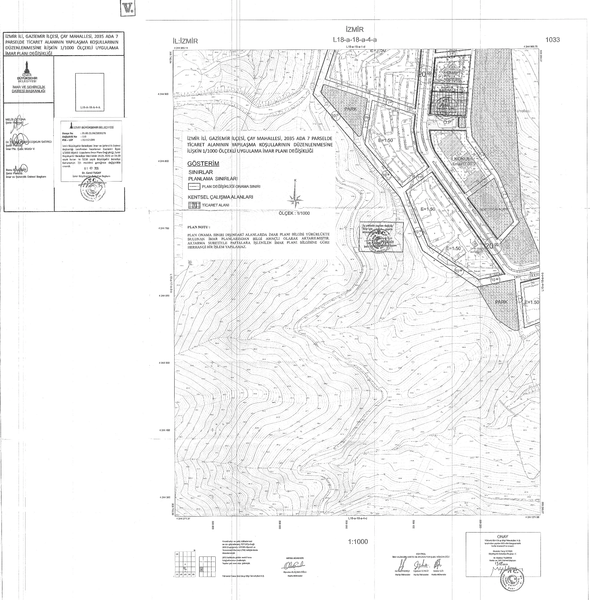 İzmir İli, Gaziemir İlçesi, Çay Mahallesi 2035 ada, 7 parselin yer aldığı Ticaret Alanının yapılaşma koşullarının düzenlenmesine ilişkin hazırlanan Bakanlığın UİP -351121699 plan işlem numaralı 1/1000 ölçekli Uygulama İmar Planı Değişikliği.